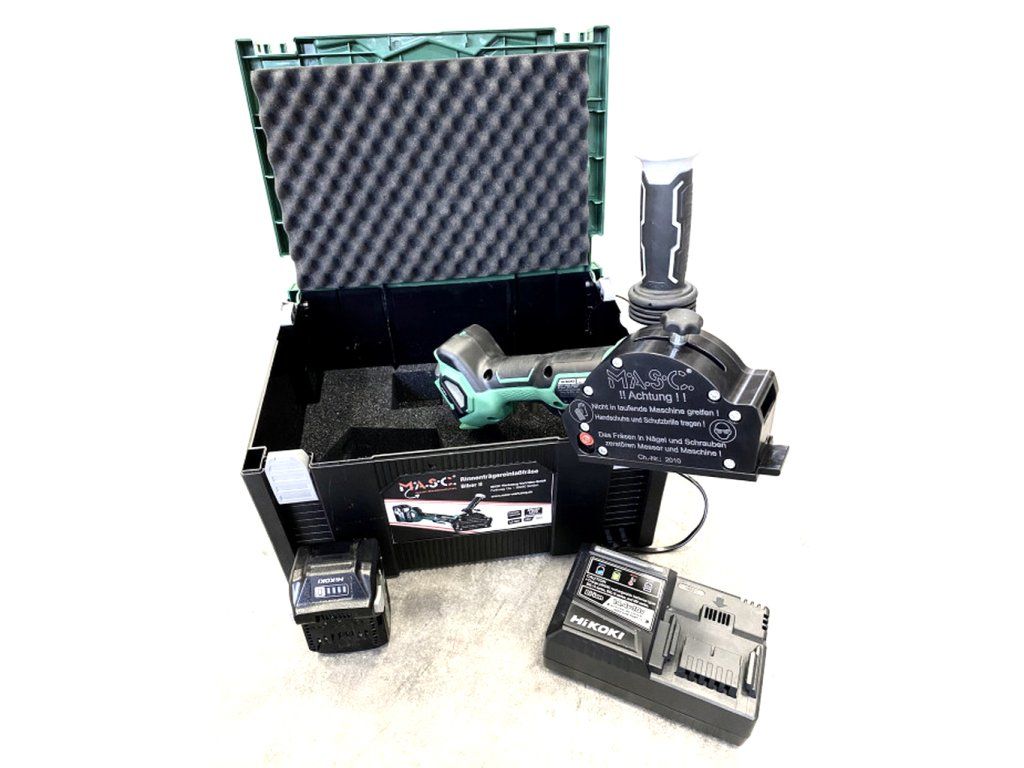 Hikoki fréza na drážky pro žlabové háky vč. baterie, rychlo-nabíječky a přepravního pouzdra. Šířka frézování je 34 mm.