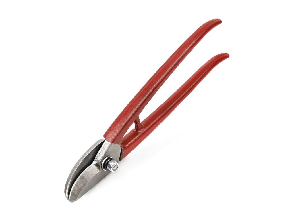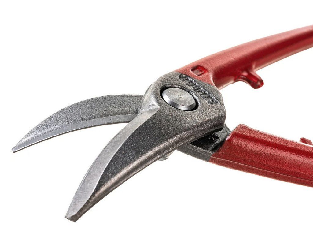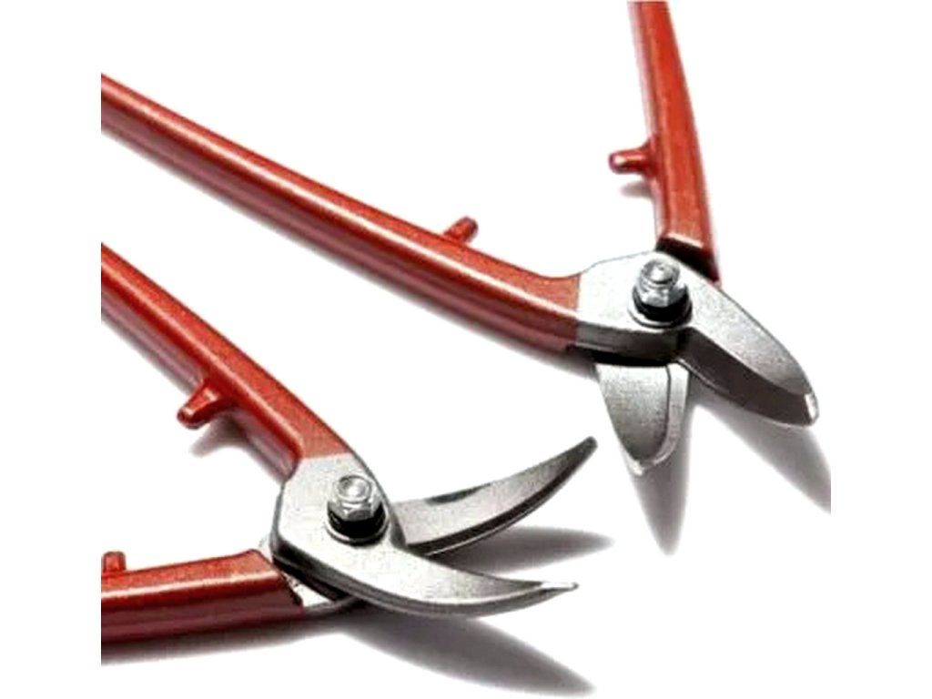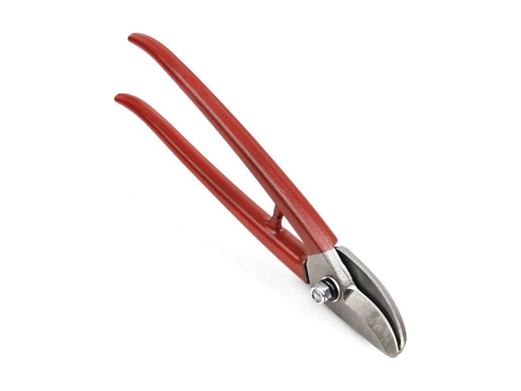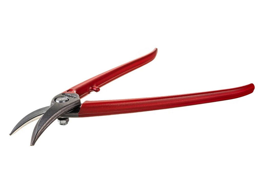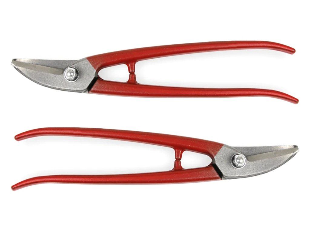 Speciální nůžky na plech s kruhovými čepelemi pro střihání přesných obloukových tvarů ve variantách červený lak a zelený plast (pravé).