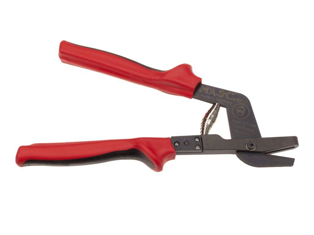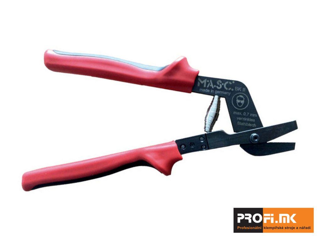 Drážkovací nůžky MASC BK1-II se středovým spojem se používají pro rovné a paralelní střihy profilů. Zabraňují trhlinám v plechu při následném falcování. Výsledný střih je čistý, bez ostrých hran a nedeformuje opracovávaný materiál. Díky speciálním čelistem střihají průběžné střihy libovolné délky se zaobleným koncem a zamezí tak dalšímu natrhnutí plechu při následném falcování.