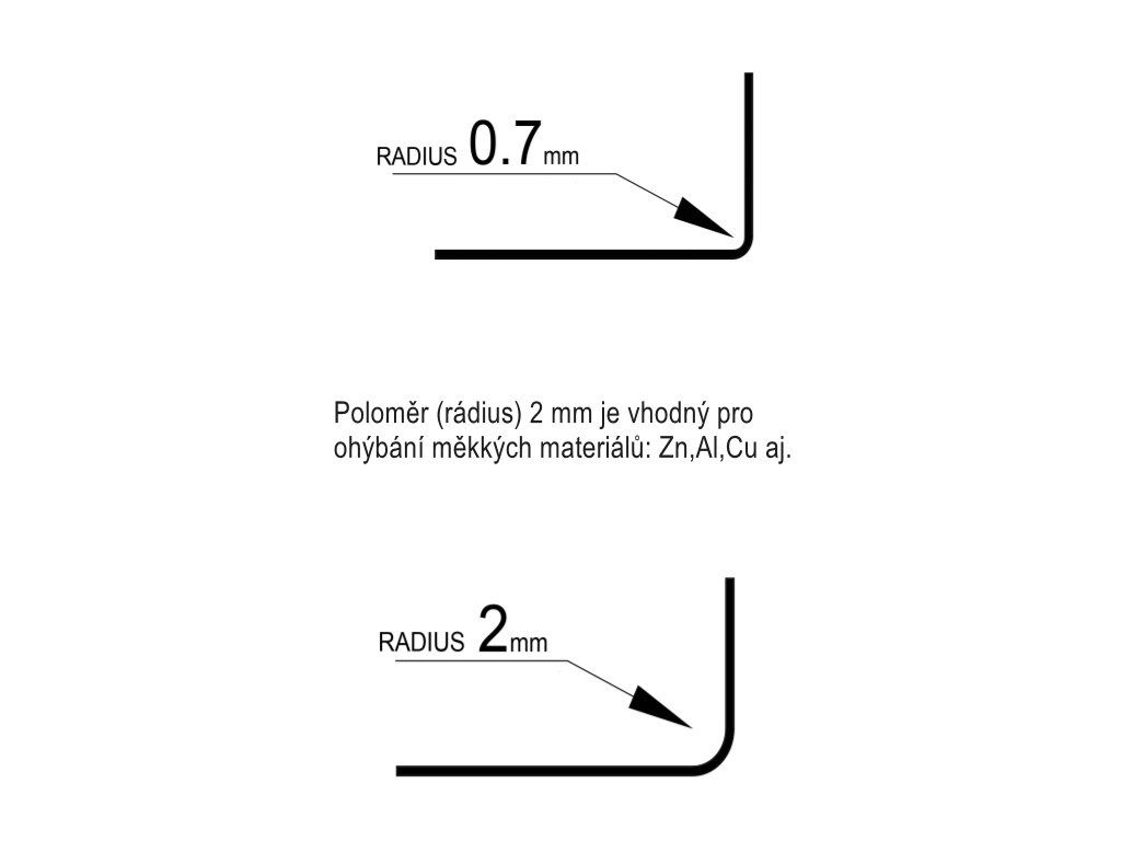 Poloměr (rádius) standardního ohýbacího kolečka (koleček), které je součástí ručních ohýbaček je 0,7 mm. Toto kolečko je vhodné pro ohýbání ocelového plechu. Pro ohyb měkkých materiálů (Zn, Al, Cu aj.) je vhodné ohýbací kolečko (pro DUO ohýbačky 2 kolečka) s poloměrem 2 mm (viz obrázek v Galerii). Při použití tohoto kolečka je vhodné nastavit (zvětšit mezeru (vůli) mezi ohýbacími válečky ruční ohýbačky (viz Video).