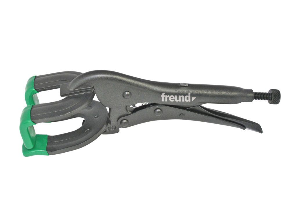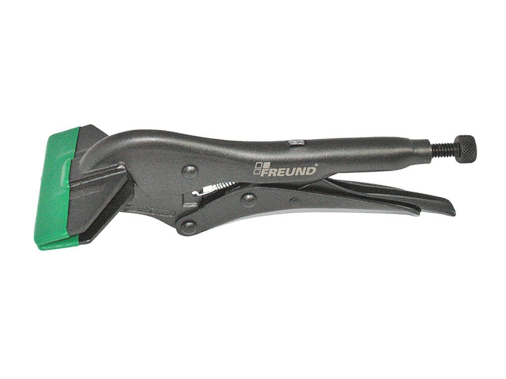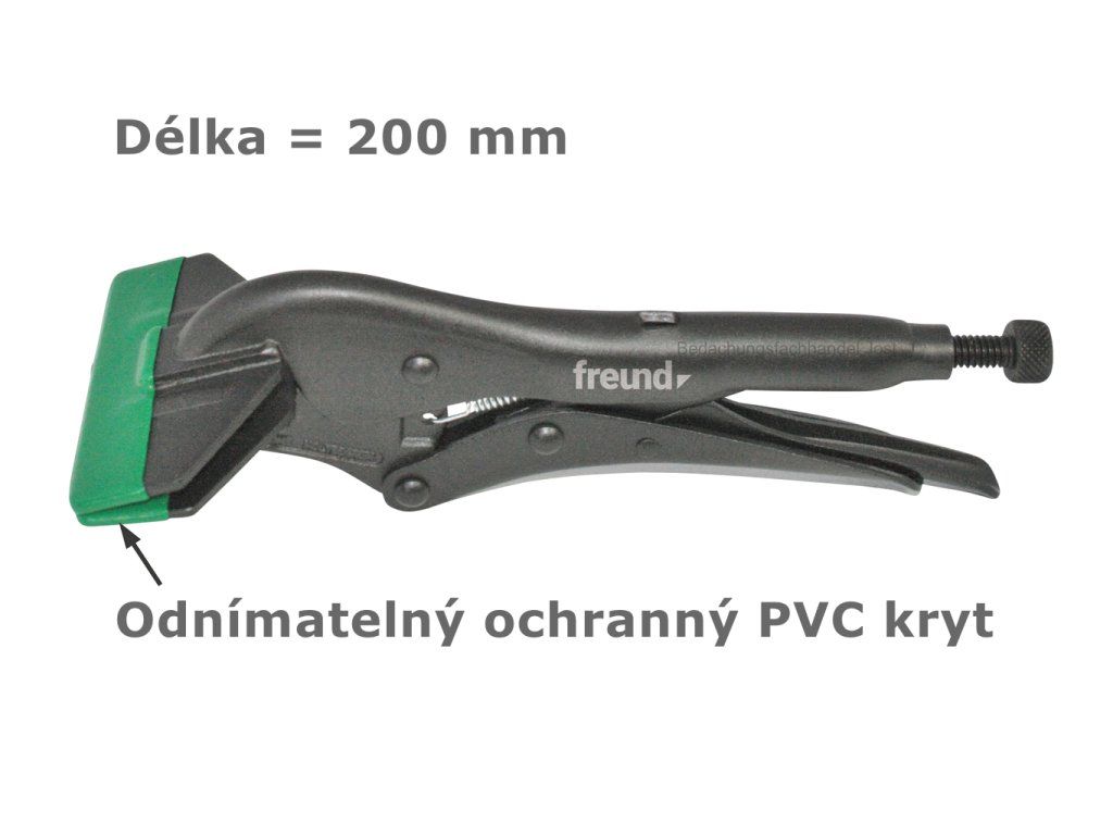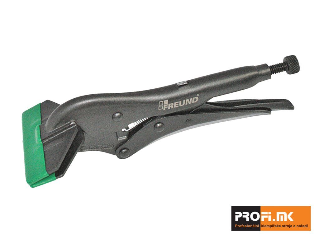 Kvalitní samosvorné kleště FREUND s plochými (zajišťovací kleště) a zahnutými (uchopovací) čelistmi s vyměnitelnou PVC ochranou. Kleště dosahují vysokého upínacího tlaku a zajistí tak dobrou stabilitu zpracovávaných dílů. Vhodné pro všechny klempířské, montážní, svařovací nebo nýtovací práce při falcování, upínání, ohýbání nebo tvarování. Nastavovacím šroubem v horní části těla kleští lze upravit potřebný tlak sevření. Uvolnění kleští se provede uvolňovací pákou. Mechanismus lomené páky umožňuje pevné a dlouhotrvající sevření různých materiálů jako jsou plechy nebo profily.