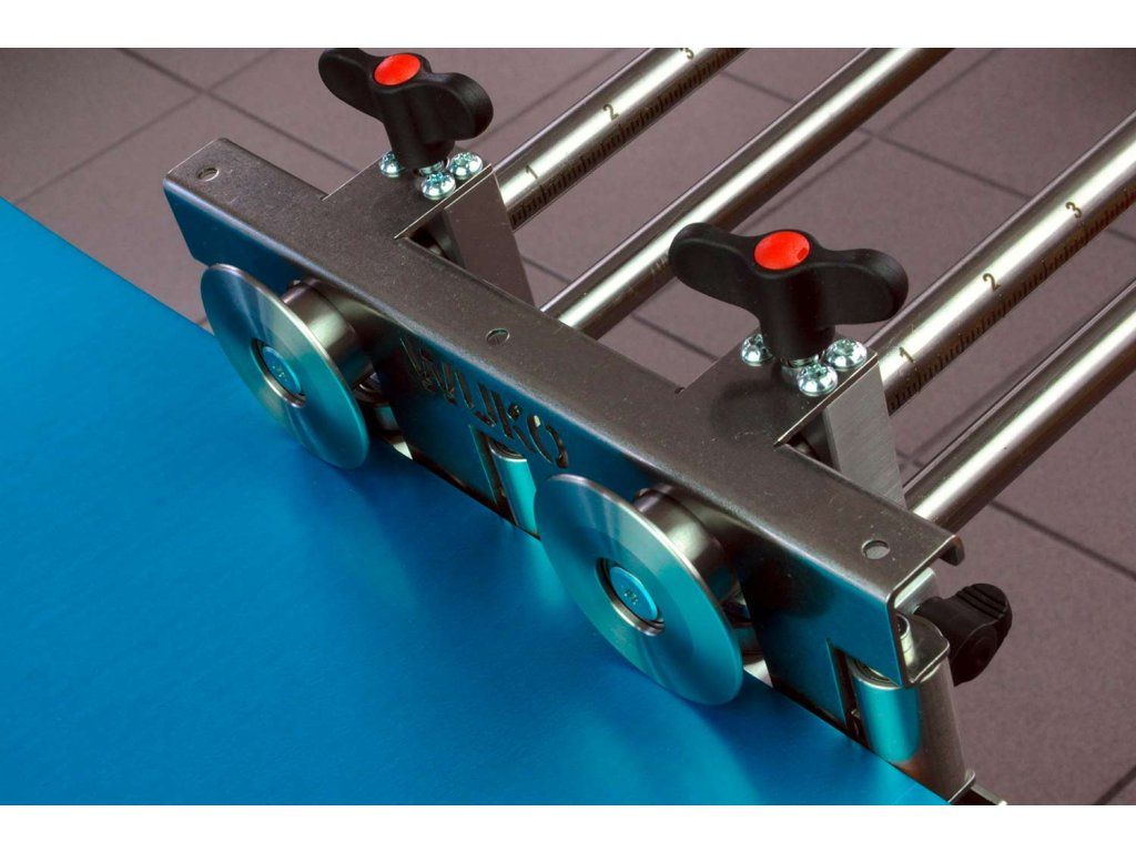 - Mezi ohýbací válce vložte plech; tenčí ohýbací válec ukazuje směr ohýbání materiálu. Okraj plechu leží proti zarážkám válce.