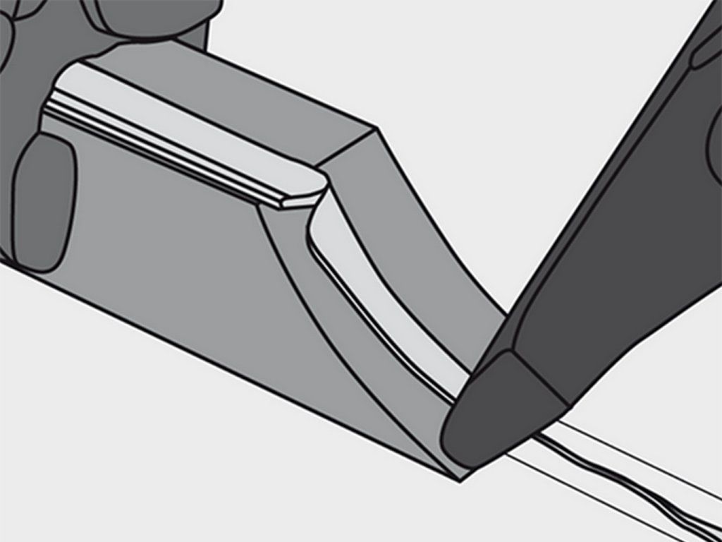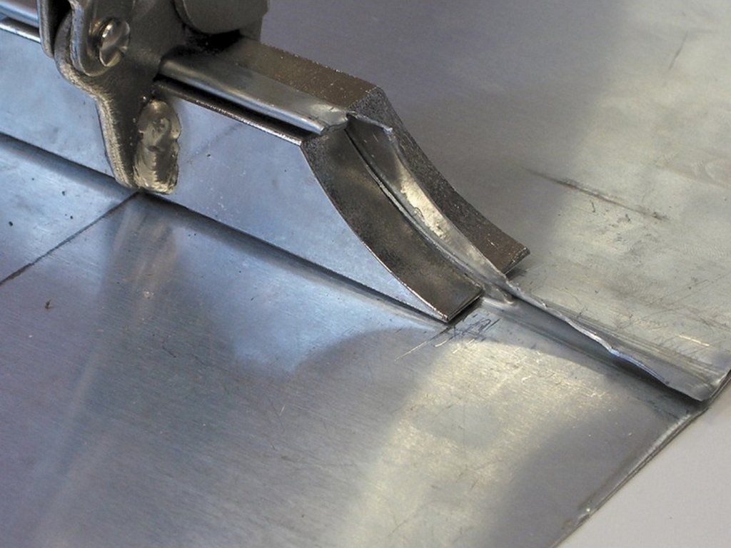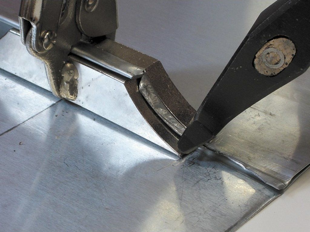 Kleště pro ukončení jednoduché nebo dvojité stojaté drážky a pro zakončení půlkruhové či šikmé okapnice.